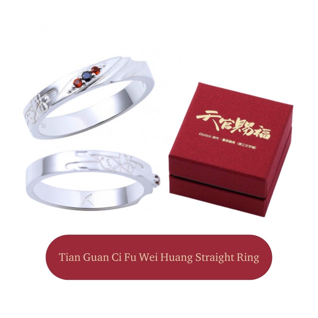 Tian Guan Ci Fu Straight Ring hadir dengan desain lurus minimalis, menampilkan pola kabut khas Tian Guan Ci Fu serta detail simbolik karakter Wei Huang dan Xie Lian. Diproduksi di Jepang dengan kualitas tinggi dan dirancang saling melengkapi saat dipakai berlapis.