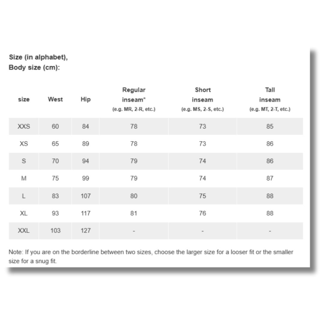Inseam: Short 29″/74 cm, Regular 31″/79 cm, Tall 34″/86 cm (bervariasi per size).