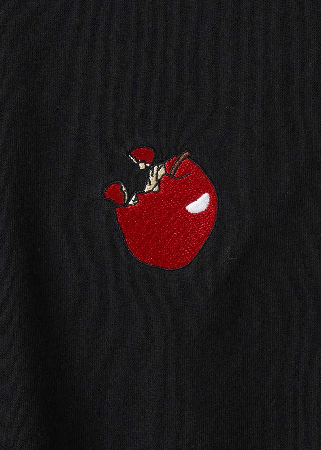 Kaos ini terbuat dari bahan jersey dengan tekstur kasar dan memiliki siluet besar yang nyaman. Saku sampingnya menggunakan kain nilon washer, menciptakan kombinasi material yang menarik sebagai aksen. Seluruh detail karakter dan buah apel pada kaos ini dipercantik dengan bordiran yang rapi.