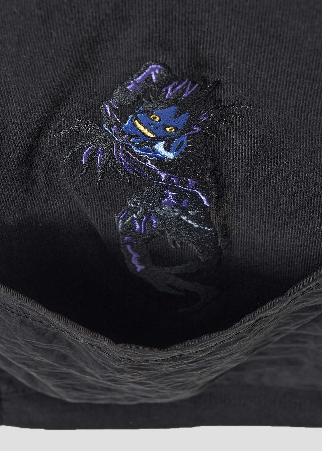 Detail pada kaos ini sangat memukau: Ryuk yang mengalami sakau karena tidak bisa makan apel dan buah apel sendiri ditampilkan melalui bordiran yang presisi.