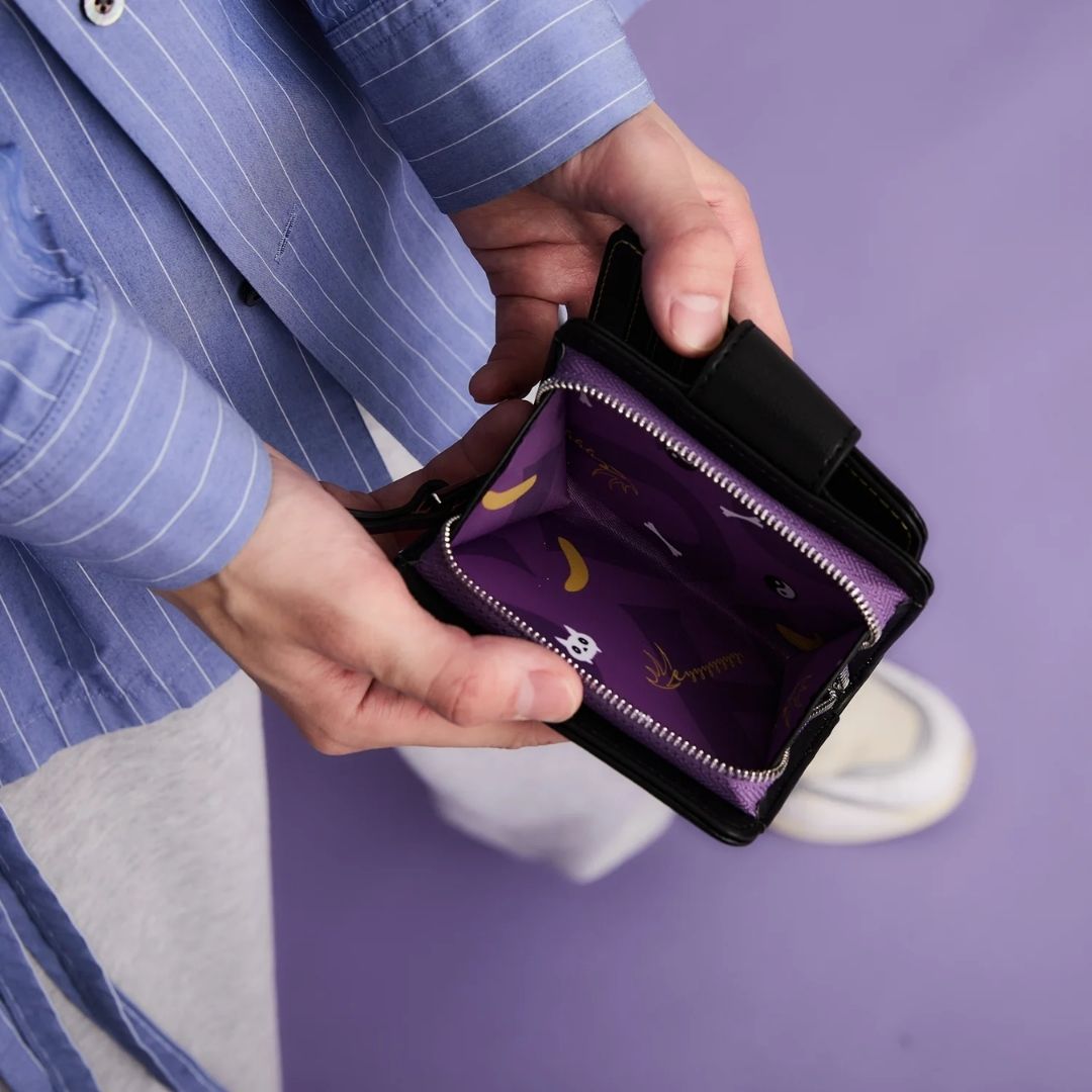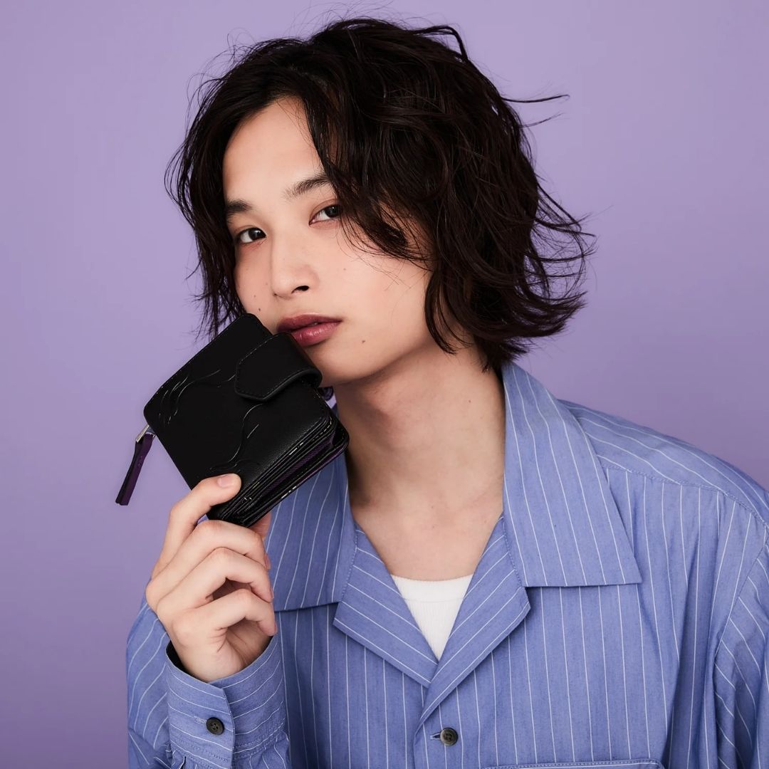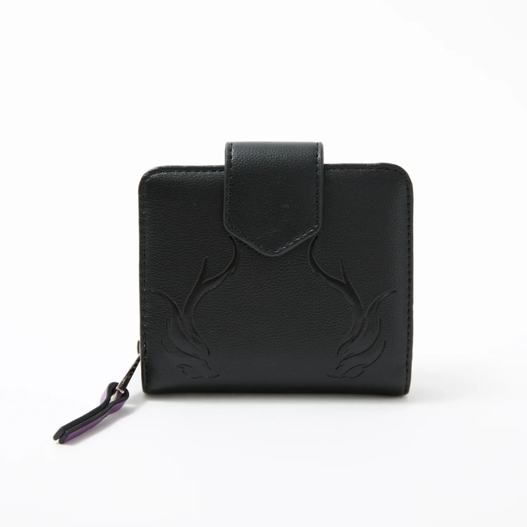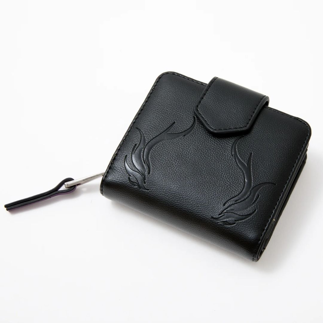 Dompet lipat dua edisi Yamino Shu dari kolaborasi Super Groupies x Nijisanji EN hadir dengan nuansa hitam elegan dan aksen ungu yang mencolok. Desain emboss motif api di bagian depan dan interior khas penuh detail seperti skull dan ilustrasi eksklusif memberikan sentuhan karakter kuat.