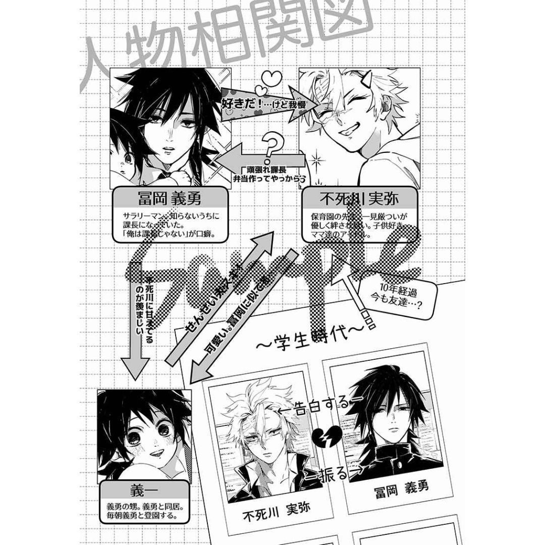 Doujinshi ini adalah karya baru dari lingkaran [Sumibi-Aburi] untuk acara “Nagi de Swaying Windmill DR2021”. Ini adalah buku “Lovesick” yang menampilkan Tomioka Giyuu x Shinazugawa Sanemi. Karya ini adalah buku parodi yang menggambarkan Giyuu sebagai kepala seksi pekerja kantoran (salaryman) dan Sanemi sebagai guru TK (nursery teacher). Giyuu pernah menyatakan cintanya kepada Sanemi saat masa sekolah dan ditolak, namun bahkan setelah 10 tahun berlalu, ia masih menyukai Sanemi.