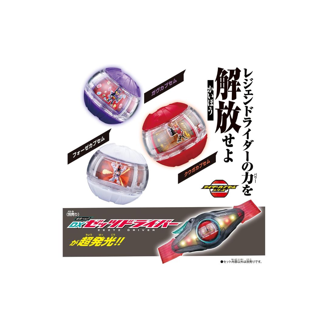 Legend Rider Capsule Set 01 adalah aksesoris eksklusif dari serial Kamen Rider Zets yang menghadirkan nostalgia lewat kapsul karakter legendaris seperti Kuga, Fourze, dan Gav. Ketika dipasangkan pada Transformation Belt DX Zetz Driver (dijual terpisah), kapsul ini mengaktifkan suara khas dan efek cahaya spesial dari masing-masing Rider.