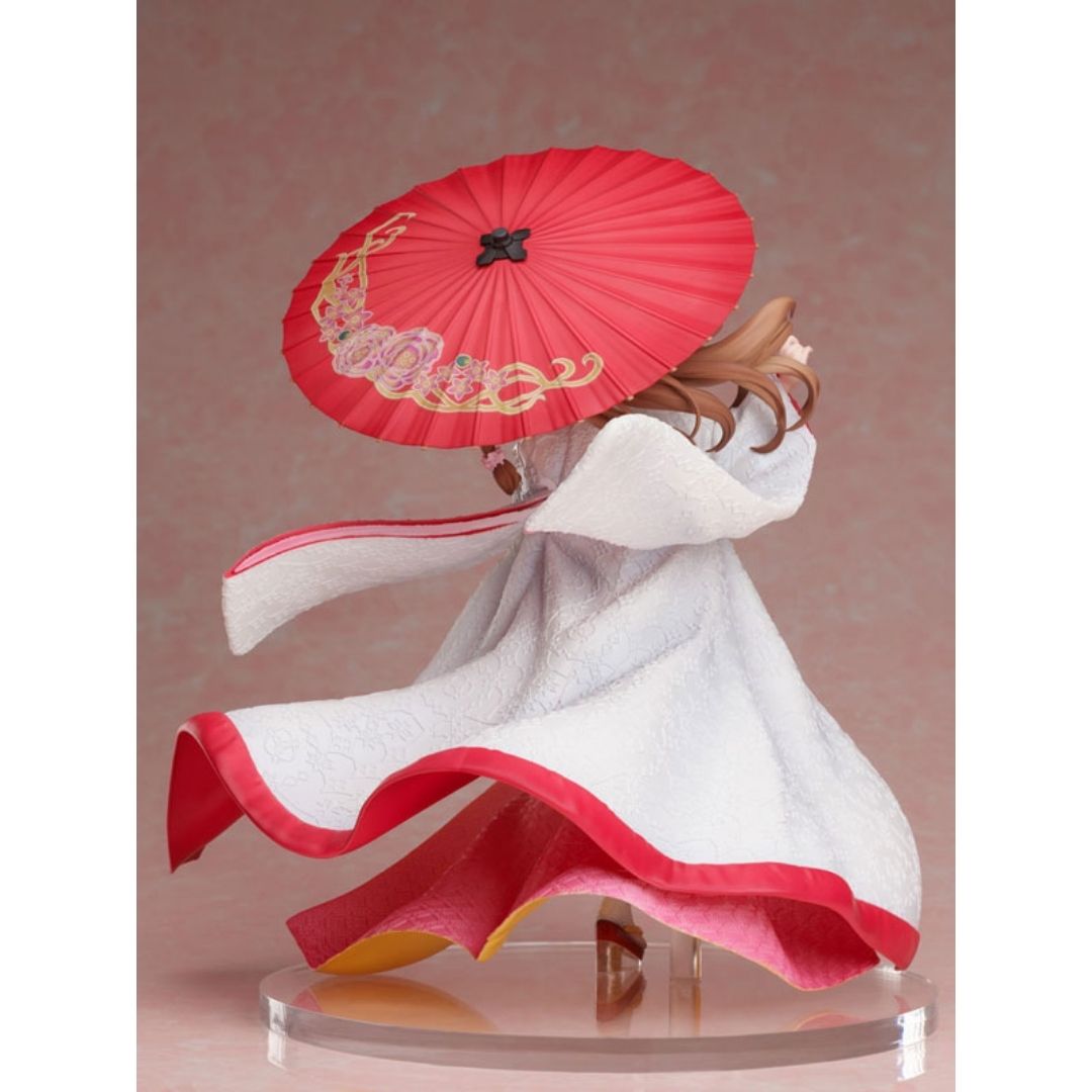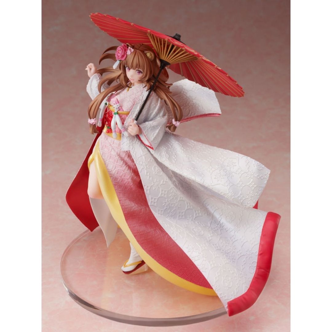 1/7 TATE NO YUUSHA – FIGURE RAPHTALIA: SHIROMUKU tampil anggun dalam balutan kimono pengantin putih. Detail halus kimono, aksesoris rambut peony, dan payung merah memberi nuansa elegan.
