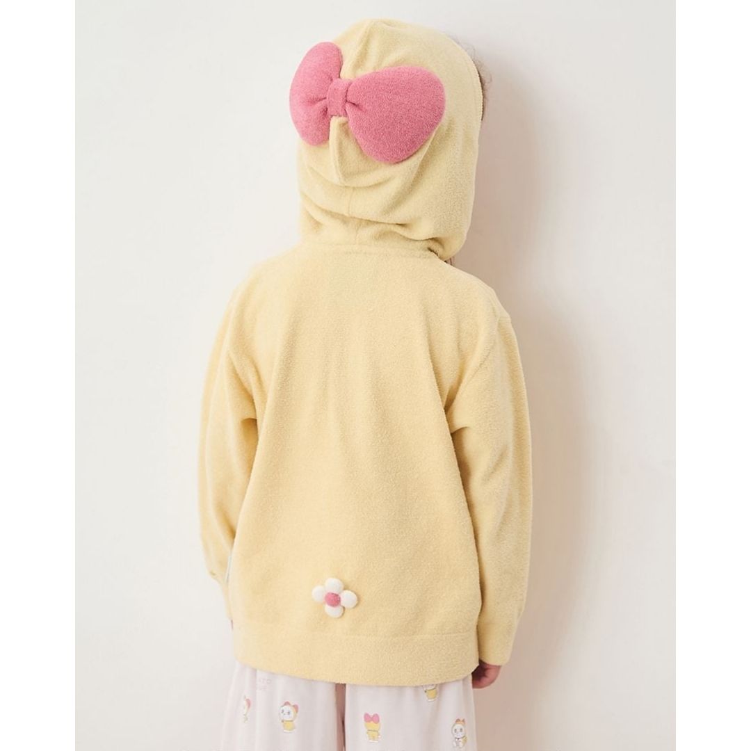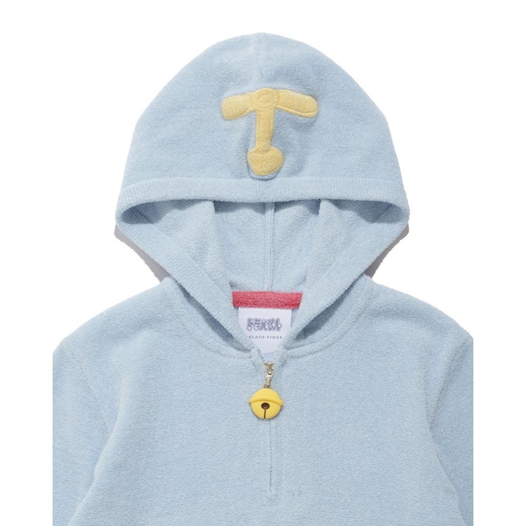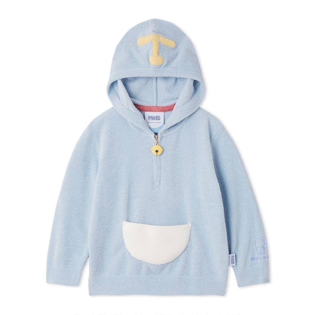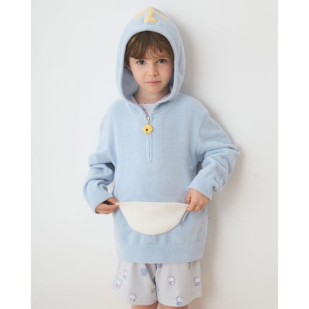 Gelato Pique Doraemon Kids Hoodie berbahan Airy Moco lembut dan ringan, dengan desain playful kantong dimensi keempat, ekor 3D, dan ritsleting lonceng. Tersedia dalam biru Doraemon dan kuning Dorami, nyaman untuk bermain atau bersantai.