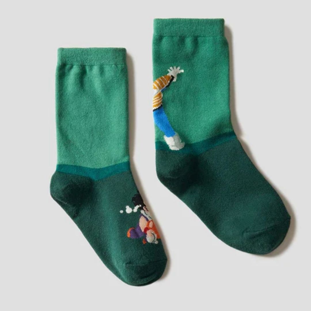 Lengkapi gaya Anda dari ujung kepala hingga ujung kaki dengan Graniph Dragon Ball Z – Hidden Dragon Ball Middle Socks! Kaos kaki middle ini menampilkan desain rajutan jacquard yang menggambarkan adegan Vegeta menyembunyikan Dragon Ball di danau Namek, sementara Gohan dengan gembira menemukannya menggunakan Dragon Radar. Para penggemar setia Dragon Ball Z pasti akan menyukai detail yang terinspirasi dari arc Namek ini.