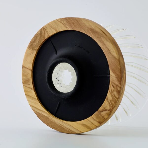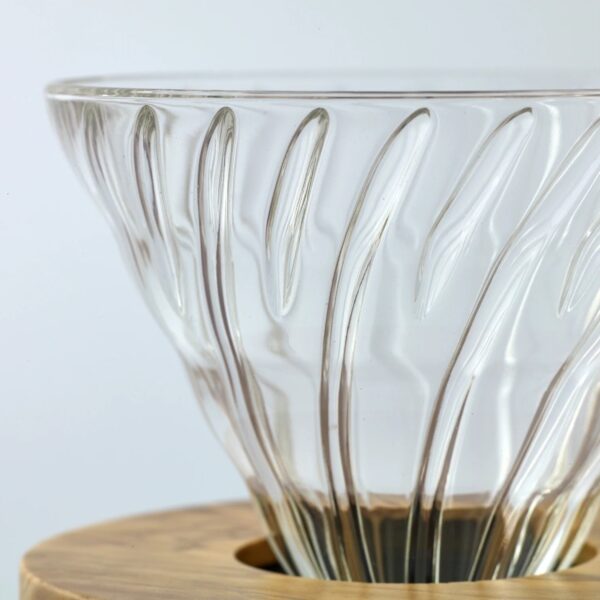 Terbuat dari kaca tahan panas berkualitas tinggi yang memungkinkan Anda melihat proses ekstraksi kopi secara jelas. Bagian pegangannya terbuat dari kayu zaitun yang memberikan kesan alami dan hangat. Memiliki desain kerucut khas Hario V60 dengan alur spiral di bagian dalam, yang membantu mendistribusikan air secara merata saat proses penyaringan. Kombinasi kaca transparan dan kayu zaitun memberikan tampilan yang elegan dan modern.