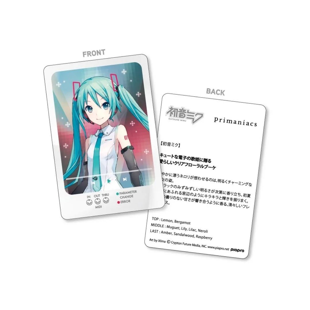 Nikmati keharuman khas Hatsune Miku dengan Hatsune Miku Fragrance PRIMANIACS edisi terbaru. Aroma neroli yang lembut menghadirkan kesan ceria dan menawan, sementara sentuhan lilac menebarkan kilau segar seperti sinar matahari musim panas.
