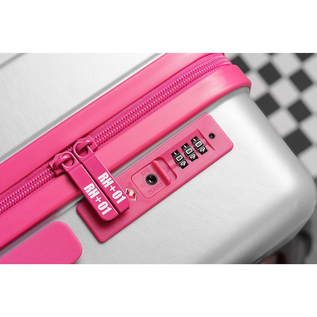Koper Hatsune Miku Racing Ver. 2025 Suitcase Pop hadir dengan desain industrial abu-abu dan aksen pink cerah, lengkap dengan inner bag, stiker DIY, serta baggage tag bernomor acak untuk pengalaman travel yang unik dan fungsional.