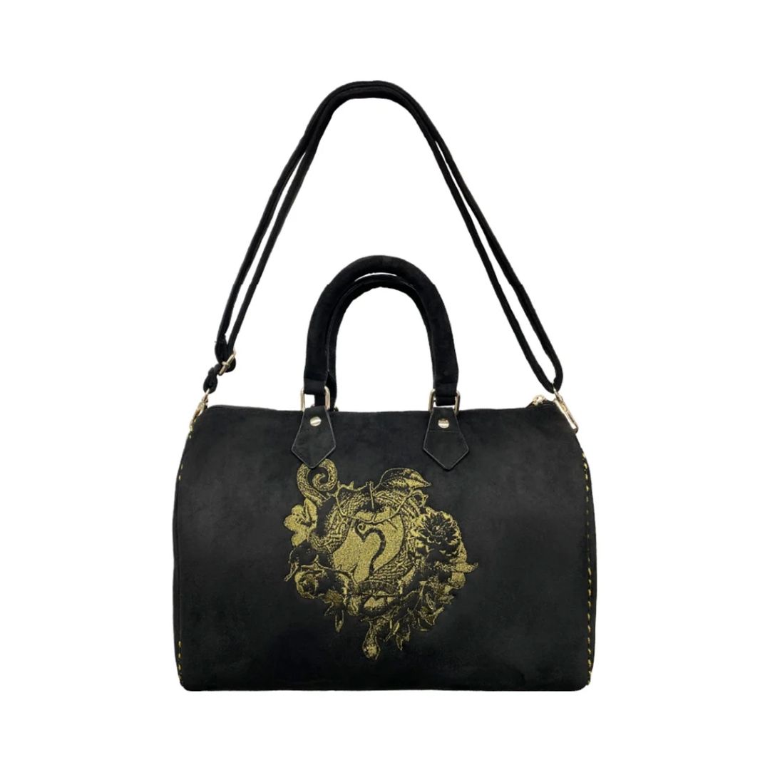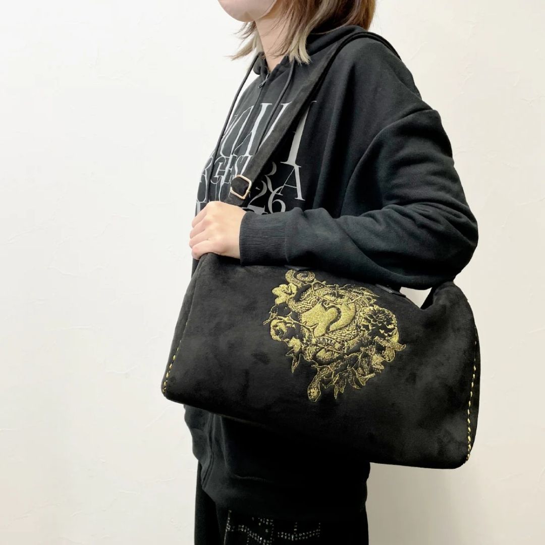 HYDE Orchestra Tour 2026 JEKYLL Mini Boston Bag merupakan tas eksklusif dengan material suede hitam elegan dan bordir logo emas khas HYDE. Desain 2-way memungkinkan digunakan sebagai Boston bag atau shoulder bag, praktis untuk harian sekaligus item koleksi bernilai.
