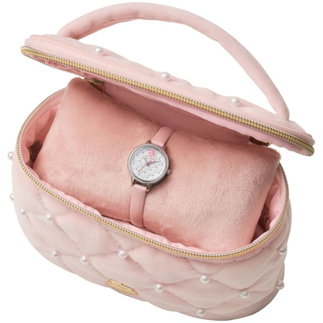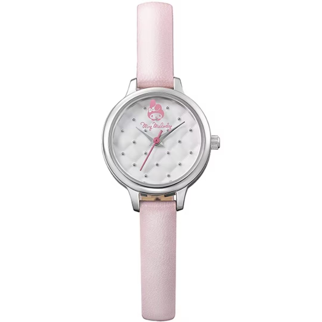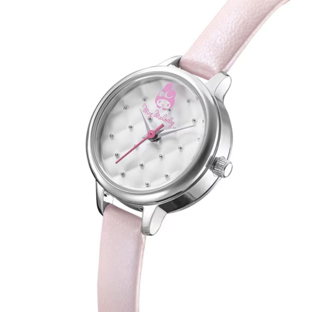 Tampil manis dengan Angel Heart KR24SS edisi spesial My Melody Collaboration! Jam tangan ini memiliki dial quilted unik dengan motif wajah My Melody pada kaca, serta strap kulit berwarna baby pink yang lembut dan feminin. Dilengkapi dengan vanity pouch eksklusif berbahan boa yang dapat digunakan sebagai tempat makeup atau penyimpanan kecil.