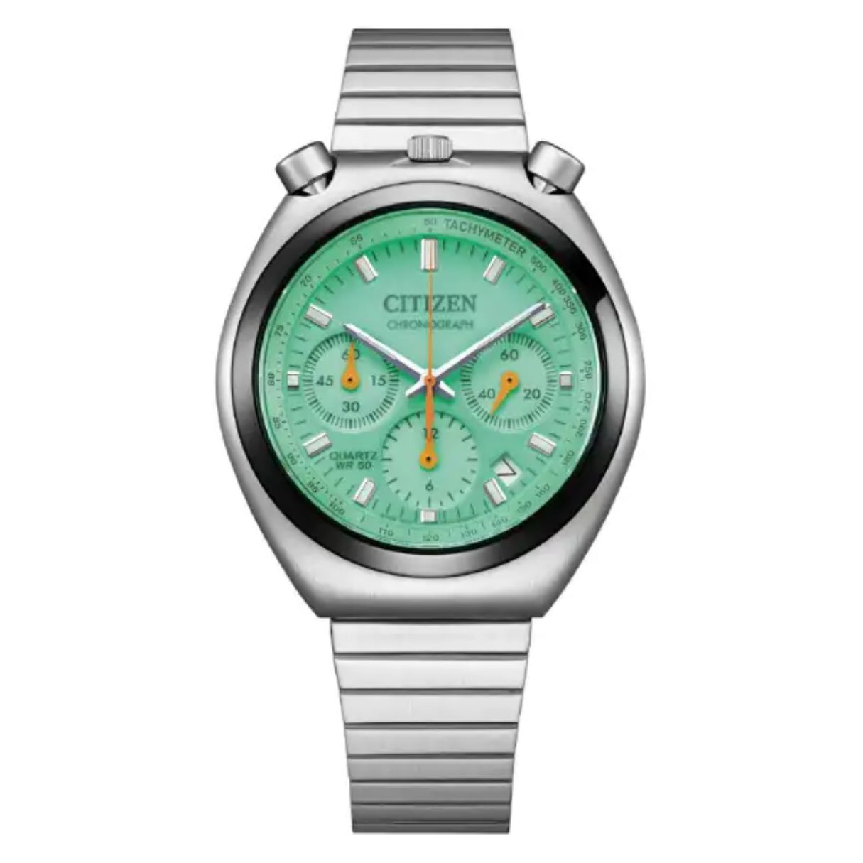Seri Record Label Playground Edition menghadirkan kembali siluet legendaris Tsuno Chrono atau desain Bullhead. Jam tangan Citizen ini menonjolkan karakter unik dengan tombol crown dan pusher di atas case, menciptakan tampilan retro berani yang berbeda dari kronograf konvensional.