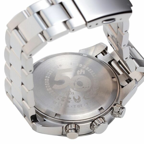 Jam Tangan Kamen Rider edisi spesial terinspirasi dari New Cyclone di Kamen Rider. Desain chronograph-nya menyerupai panel pengukur pada Cyclone, dengan fitur fungsional seperti tampilan 24 jam dan stopwatch. Bagian belakang diukir dengan logo peringatan 50 tahun.