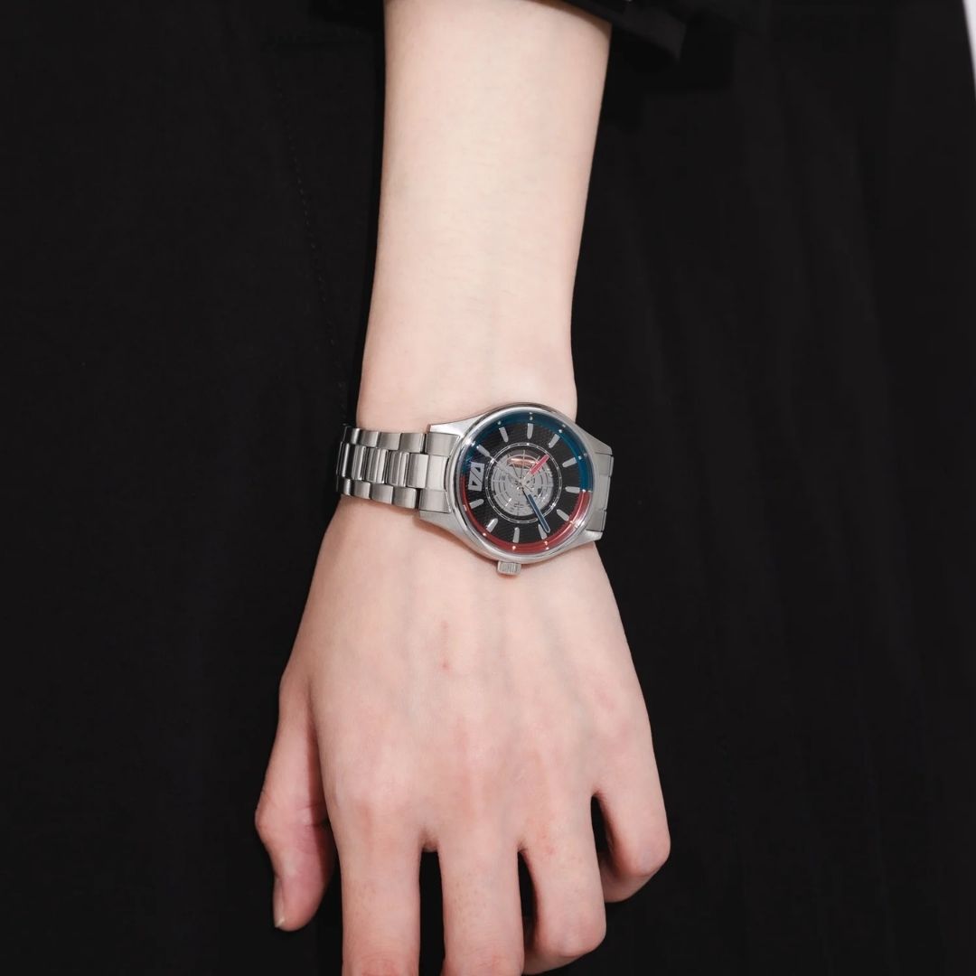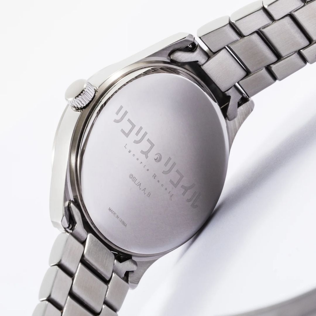Jam tangan Lycoris Recoil ini menghadirkan detail khas dari karakter Chisato dan Takina—jarum pendek berwarna merah dan jarum panjang biru mewakili warna mereka. Desain bagian dalam menampilkan siluet menara dan lambang sekolah Lycoris, dilengkapi aksen tombol serta struktur mekanikal yang elegan.
