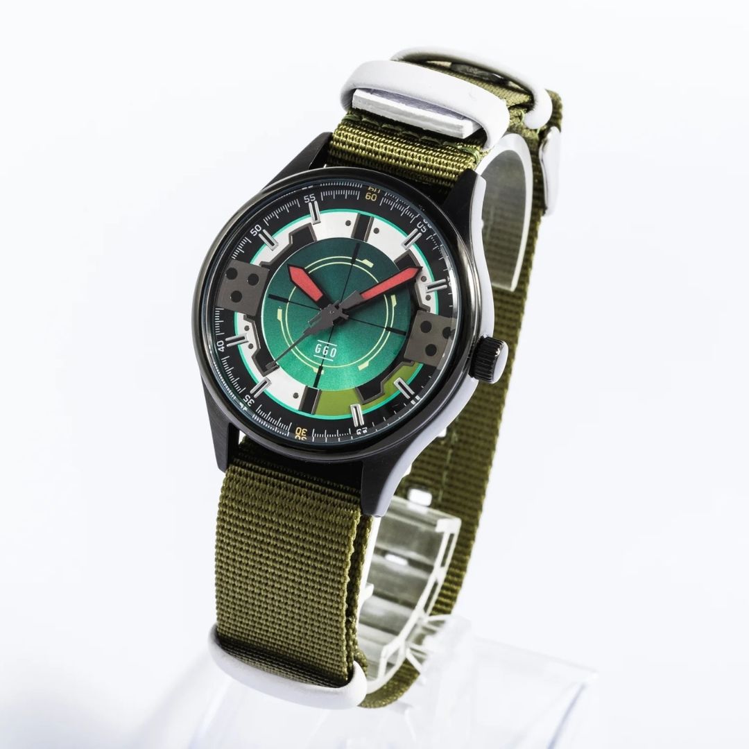 - Dial menampilkan tulisan “GGO” dengan ornamen rambut Sinon di posisi jam 3 dan 9.
