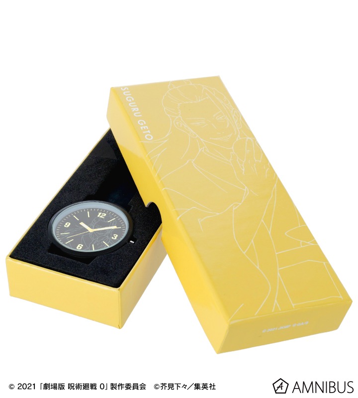 Berbasis warna hitam dengan aksen warna khas Geto Suguru, jam ini memiliki dial dengan ilustrasi Geto Suguru, serta jarum jam dan indeks yang terinspirasi dari warna karakternya. Bagian belakang casing diukir dengan motif dan nama Geto Suguru dalam huruf Romawi. Tali jamnya memiliki desain yang menggabungkan tanggal ulang tahun Anda.