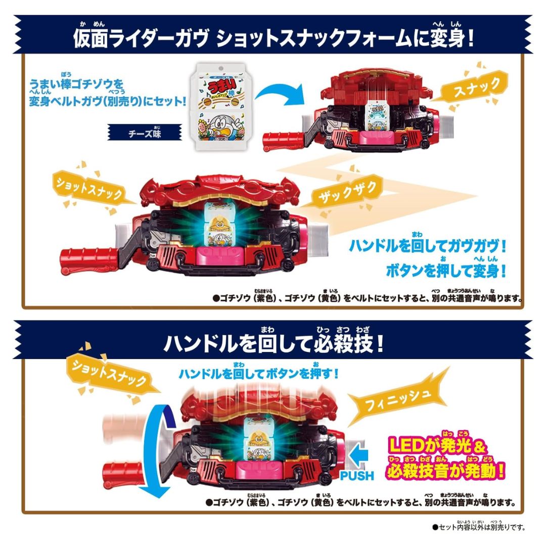 Set ini kompatibel dengan DX Transformation Belt Gav (dijual terpisah). Dengan memasang Umaibo Cheese Flavored Gotizoma, Anda dapat bertransformasi menjadi Kamen Rider Gavv Shot Snack Form! Saat Anda memasang Umaibo ungu dan kuning pada sabuk, Anda akan mendengar suara unik yang berbeda.