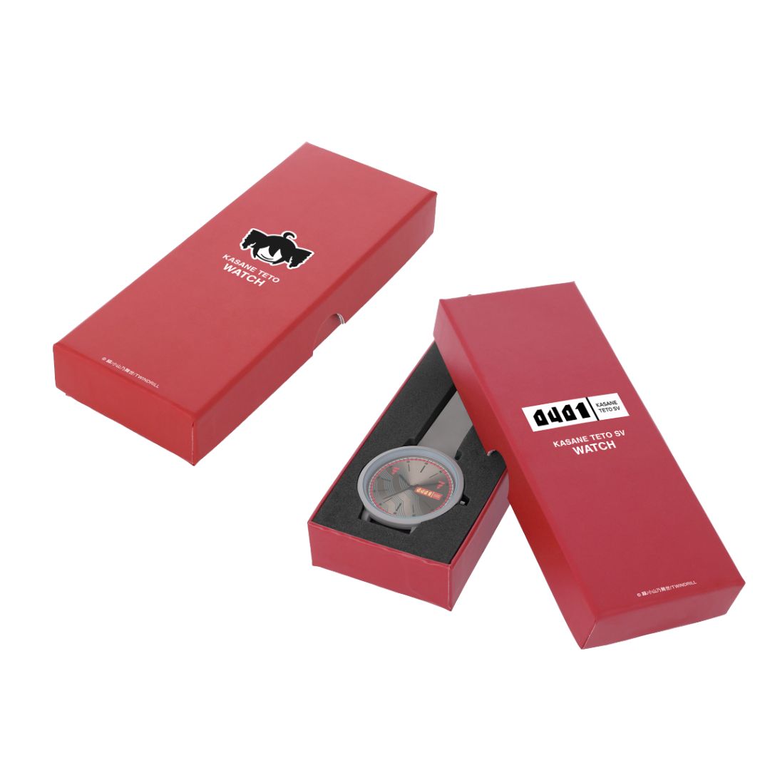 Kasane Teto SV Costume Motif Watch menggabungkan desain minimalis dengan elemen khas kostum perak Teto, seperti garis paranada musik dan twintails di jam 2 dan 10. Dilengkapi dengan logo dan kutipan ikonik di casing belakang, jam ini adalah dedikasi sempurna untuk penggemar Teto.