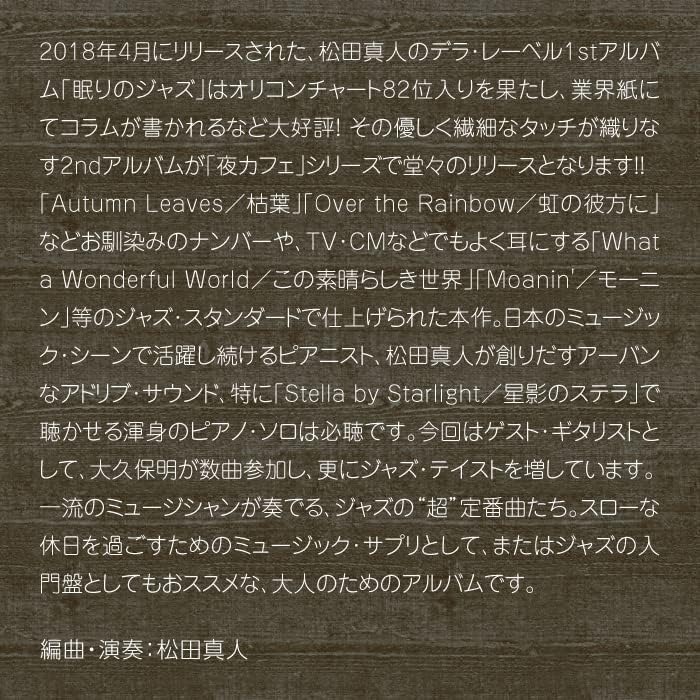 Selami suasana romantis dan menenangkan dengan Night Cafe ~ Jazz Piano, album kedua dari Masato Matsuda! Setelah sukses dengan album debutnya, Sleeping Jazz, pianis berbakat ini kembali dengan sentuhan yang lebih lembut dan halus, cocok untuk menemani malam-malam Anda.