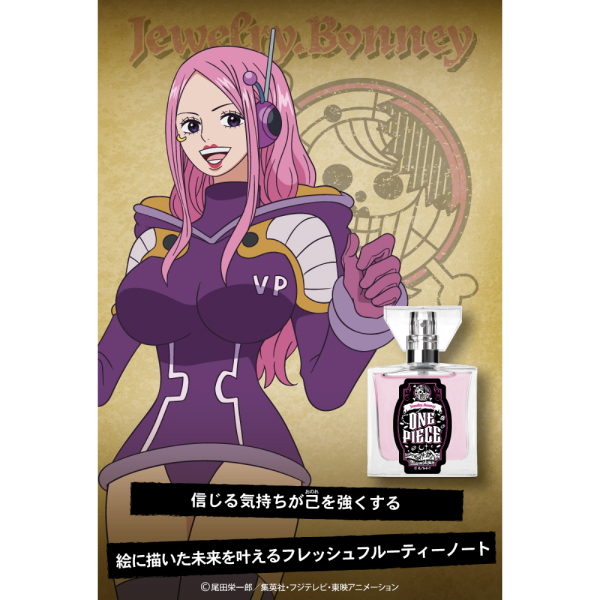 Jewelry Bonney adalah karakter yang penuh semangat dan penuh kejutan, dan parfum ini berhasil menangkap esensinya. Aroma lemon yang tajam dan cherry yang segar menyambut dengan keharuman yang ceria dan penuh kehidupan. Raspberry dan blackcurrant yang manis dan asam di tengah-tengah memberikan aroma yang menggoda. White cedar dan musk pada akhir memberikan keharuman yang lembut dan bersih, seakan melengkapi perjalanan emosional parfum ini dari segar dan ceria hingga lembut dan elegan.