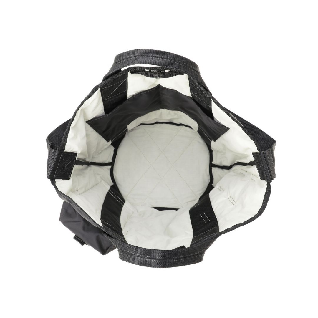 2WAY Bucket Tote ini menampilkan bentuk unik yang menggabungkan gusset bawah berbentuk ember dengan kain berbentuk kipas, memberikan tampilan yang khas dan luas.