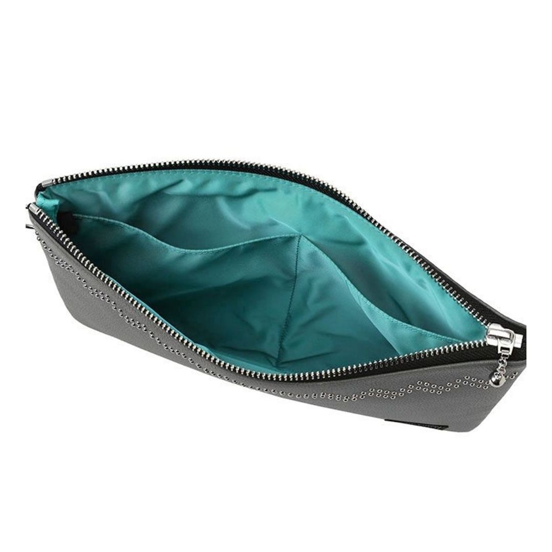 - Detail Edgy Unik: Dihiasi paku perak (studs) 3mm yang dipasang presisi di sepanjang mulut pouch.