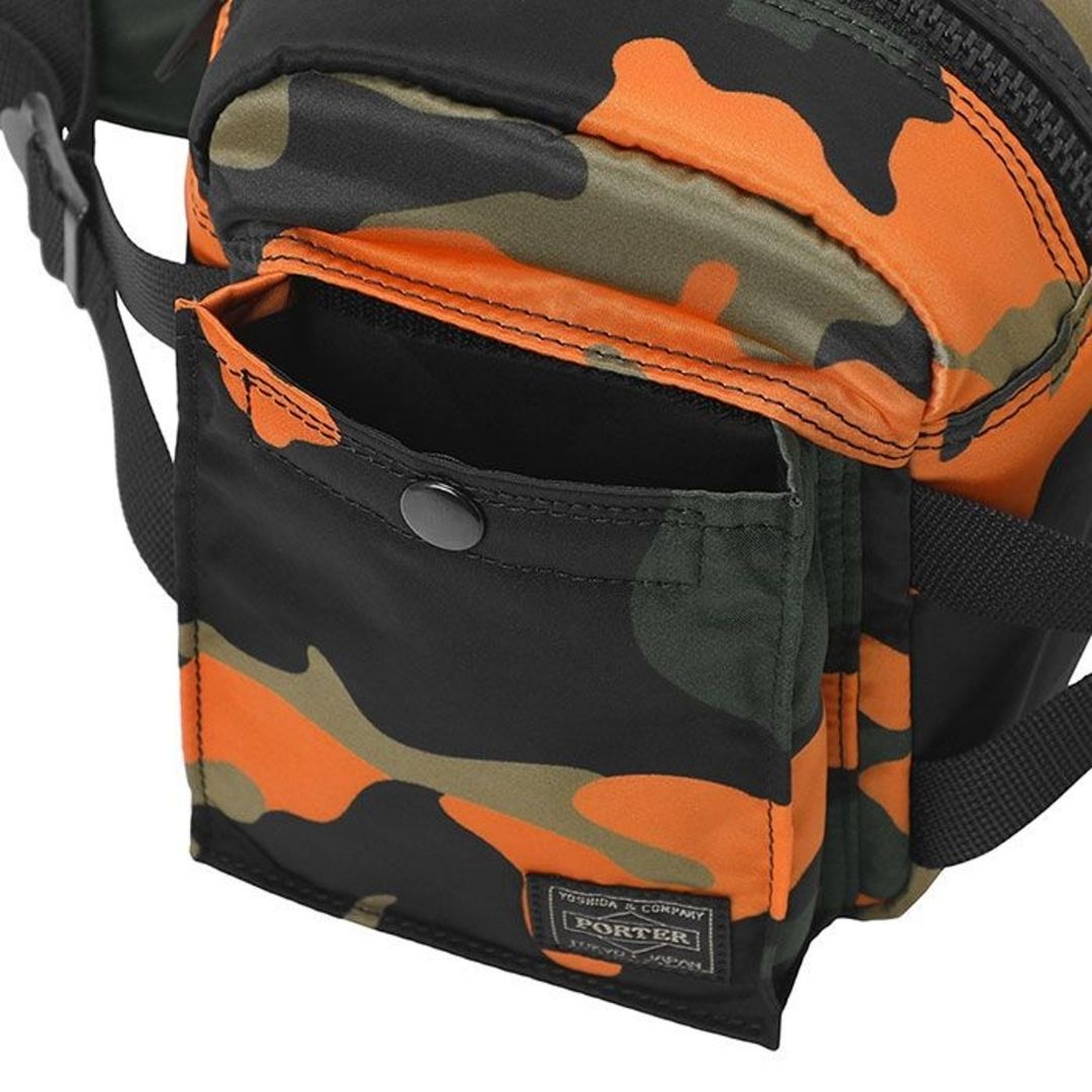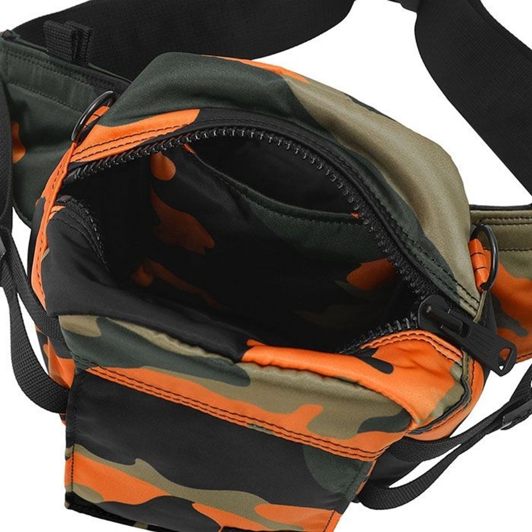 PORTER PS CAMO Fanny Pack menghadirkan desain kamuflase Woodland orisinal dengan kombinasi warna Black Olive dan Orange terang, menciptakan tampilan ringkas, berani, dan stylish.