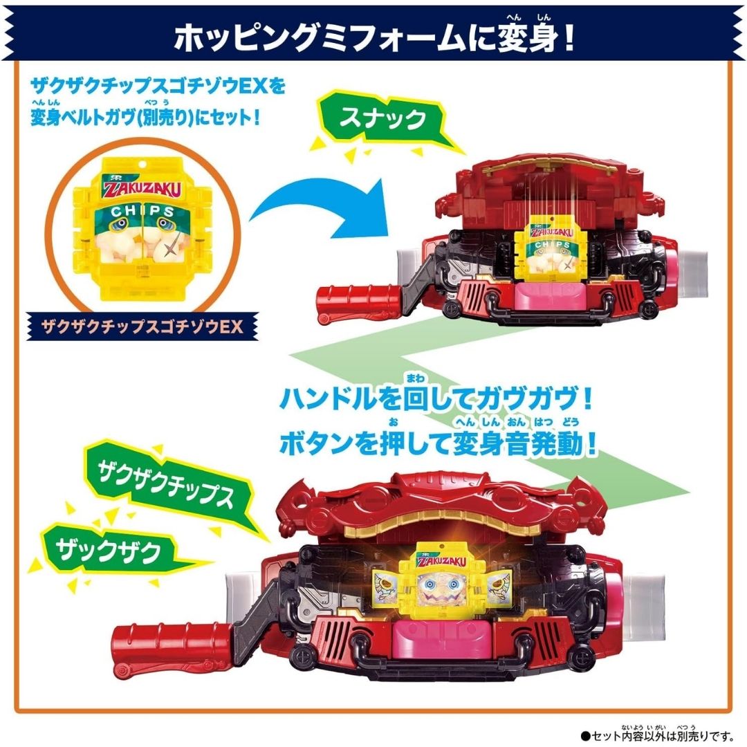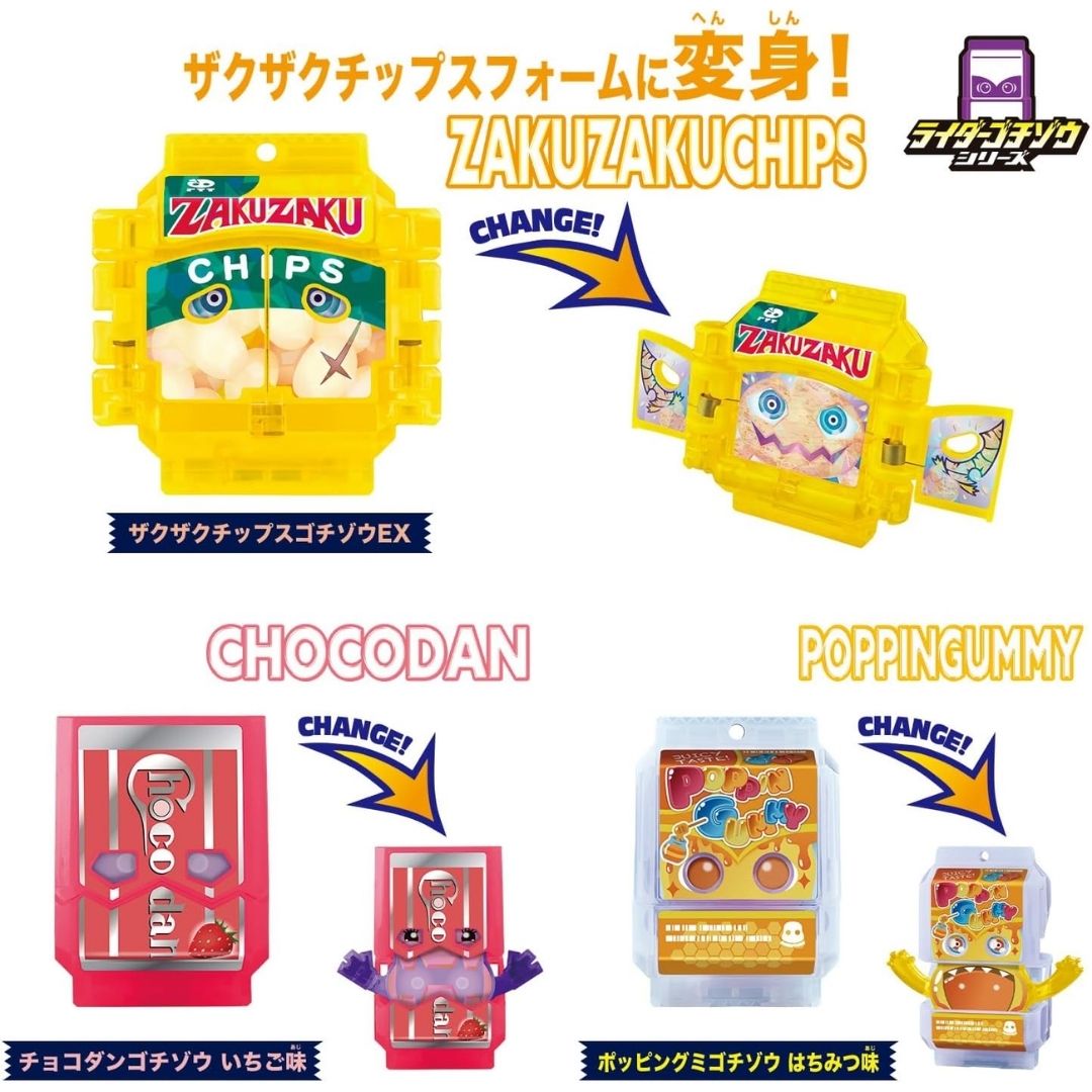 DX Rider Gochizo Set Ver.02 dari Kamen Rider Gavv menawarkan transformasi penuh aksi dengan varian berbeda dari seri sebelumnya. Set ini menampilkan Zakuzaku Chips Gourd EX, Chocolate Dungrop Strawberry Flavor, dan Popping Honey Flavor.