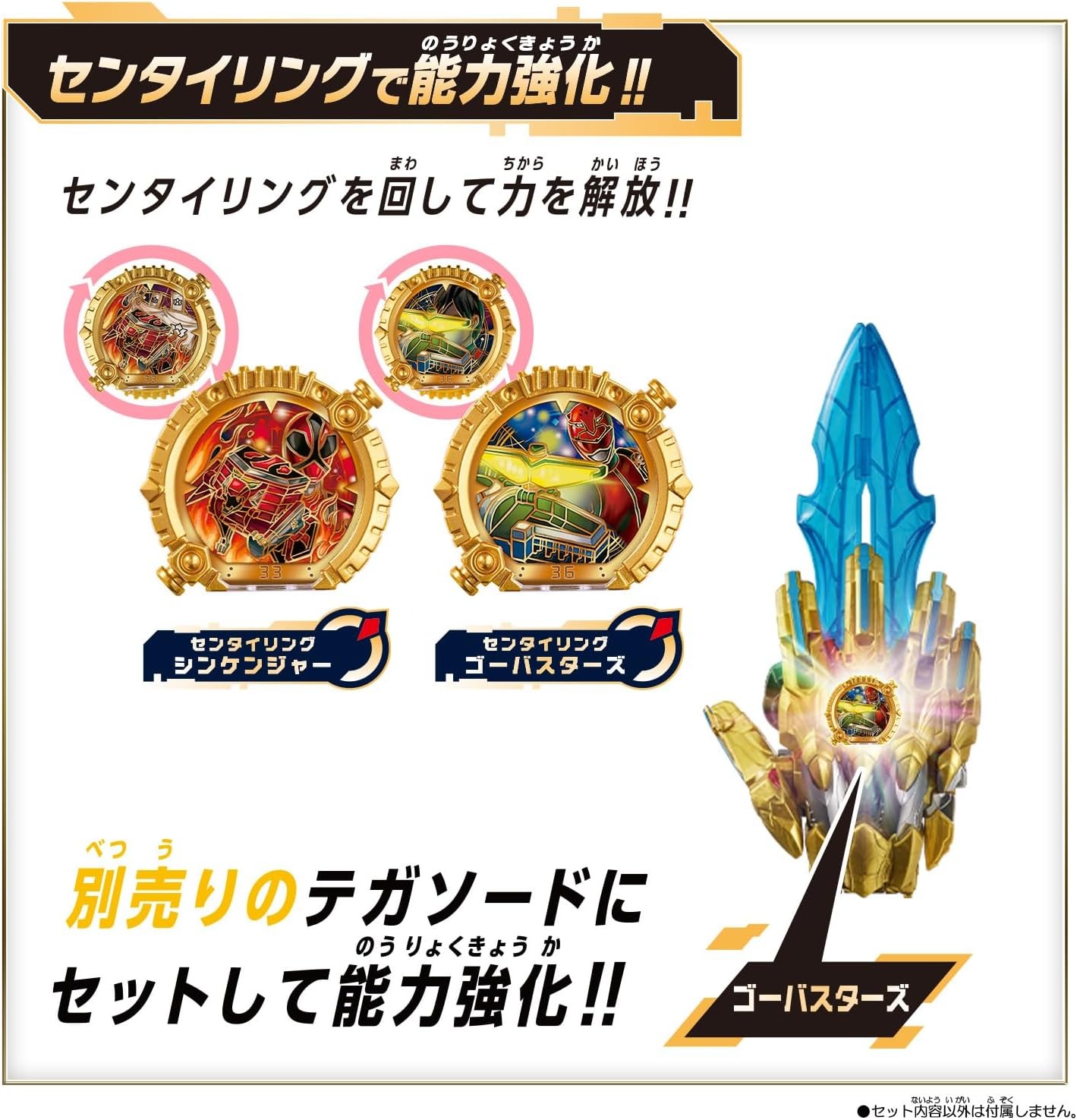 Gabungkan kekuatan Sentai Gozuger dua tim legendaris dengan DX Sentai Ring Set Shinkenger & Go-Busters dari seri No. 1 Sentai Gozyuger! Set ini berisi dua cincin sentral yang menyimpan kekuatan Shinkenger dan Go-Busters.