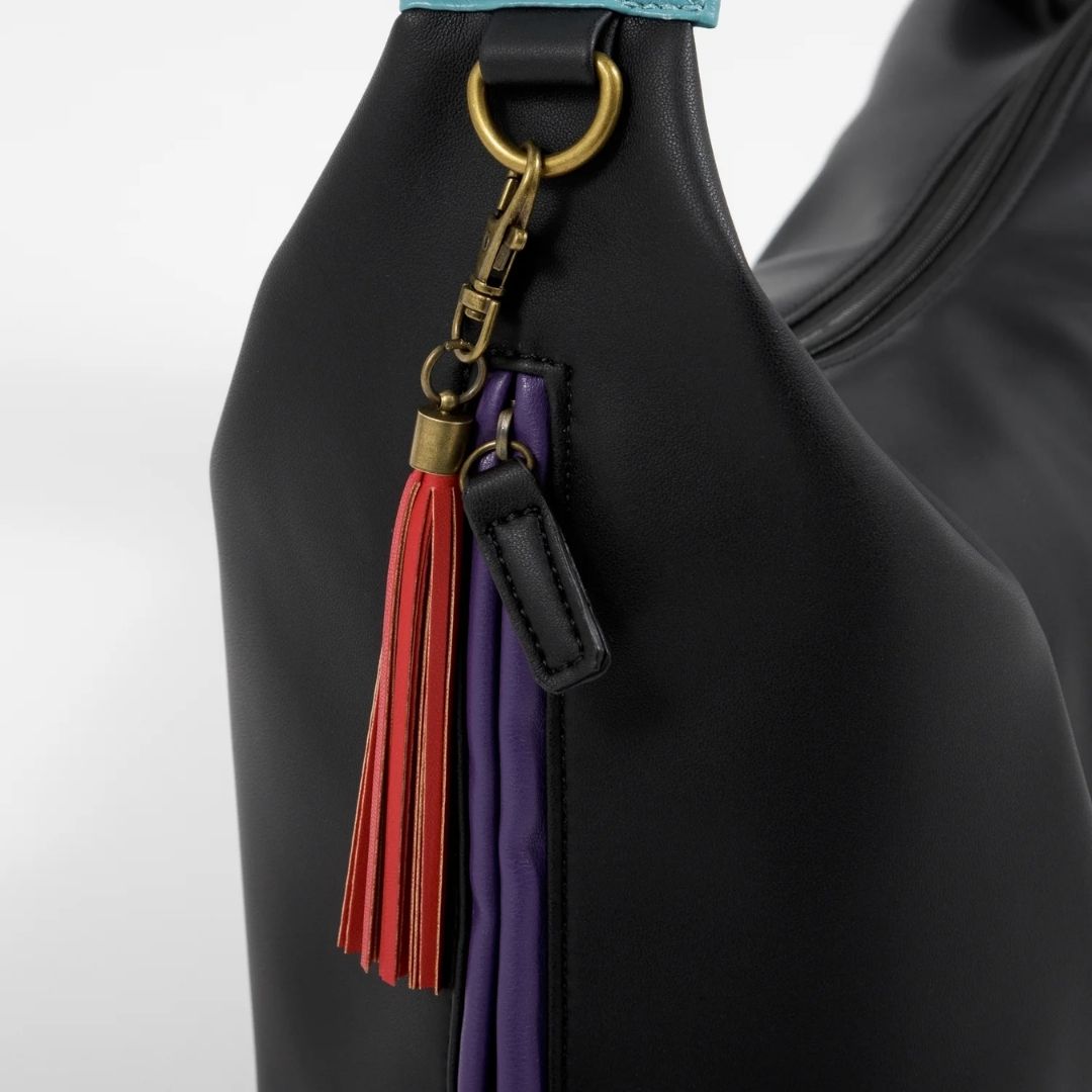Untuk kepraktisan, tas ini dilengkapi dengan saku berzipper di bagian samping dan tassel bag charm yang menambah sentuhan unik.
