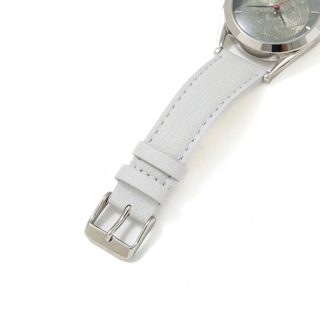 - Tali Kulit Abu-abu Terang: Kombinasi tali kulit abu-abu terang dengan metal fittings berwarna perak.