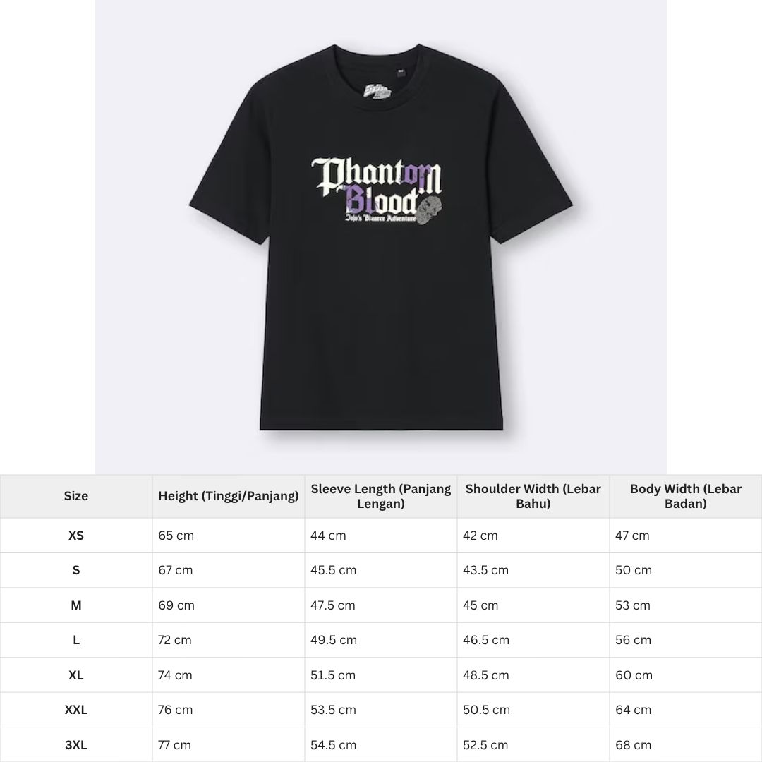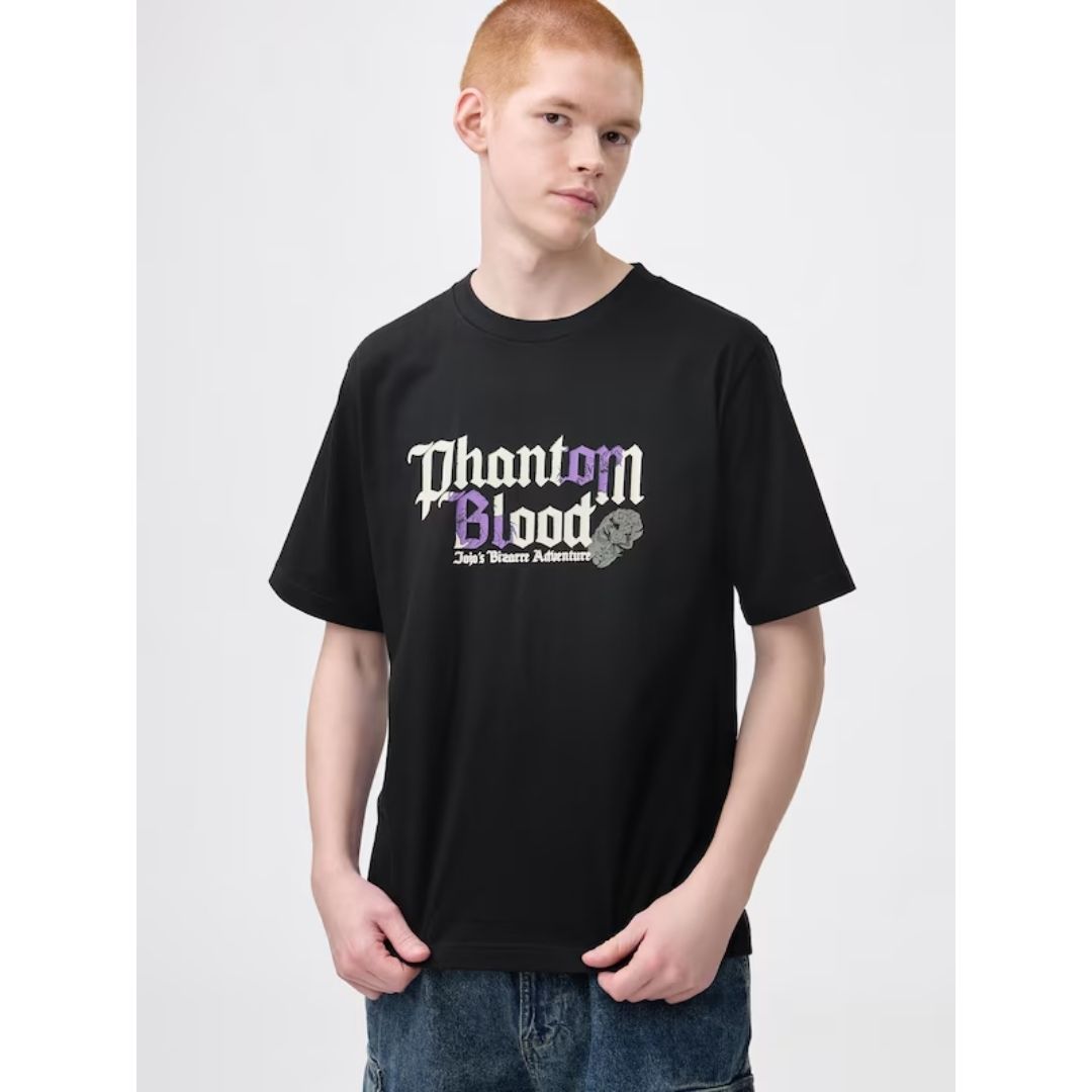 T-shirt GU x JoJo Bizarre ini menghadirkan desain dari arc Phantom Blood dengan karakter Jonathan Joestar dan Dio Brando. Visual stone mask menambah nuansa khas awal cerita JoJo. Material katun yang nyaman membuatnya ideal untuk pemakaian harian.