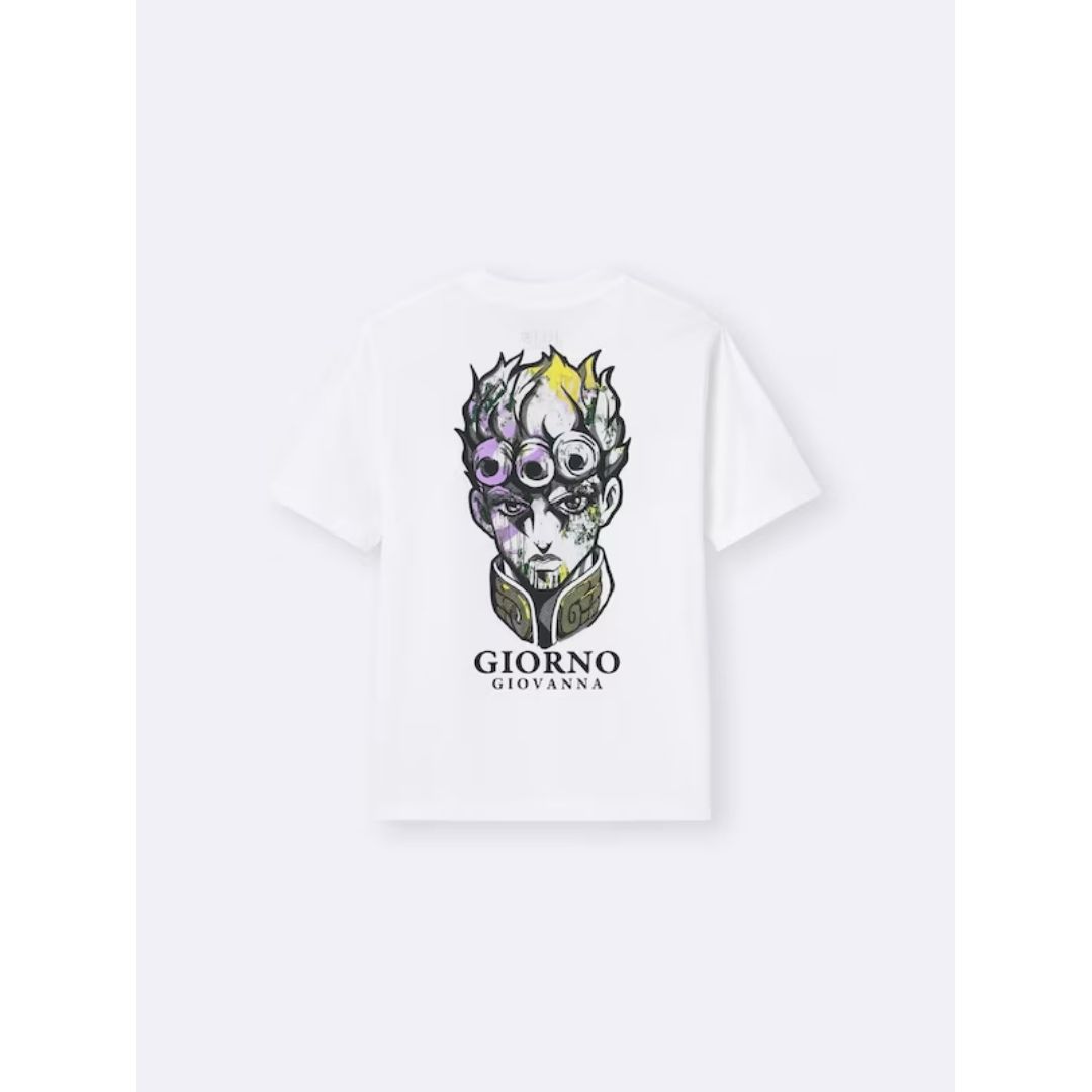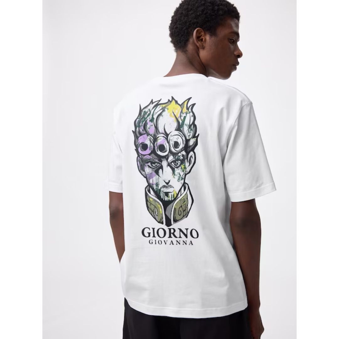 Kolaborasi T-shirt GU x JoJo Bizarre menghadirkan T-shirt dengan karakter Giorno Giovanna dalam gaya grafiti modern. Cocok untuk penggemar Golden Wind yang ingin tampil stylish. Material katun yang nyaman membuatnya cocok untuk penggunaan harian.