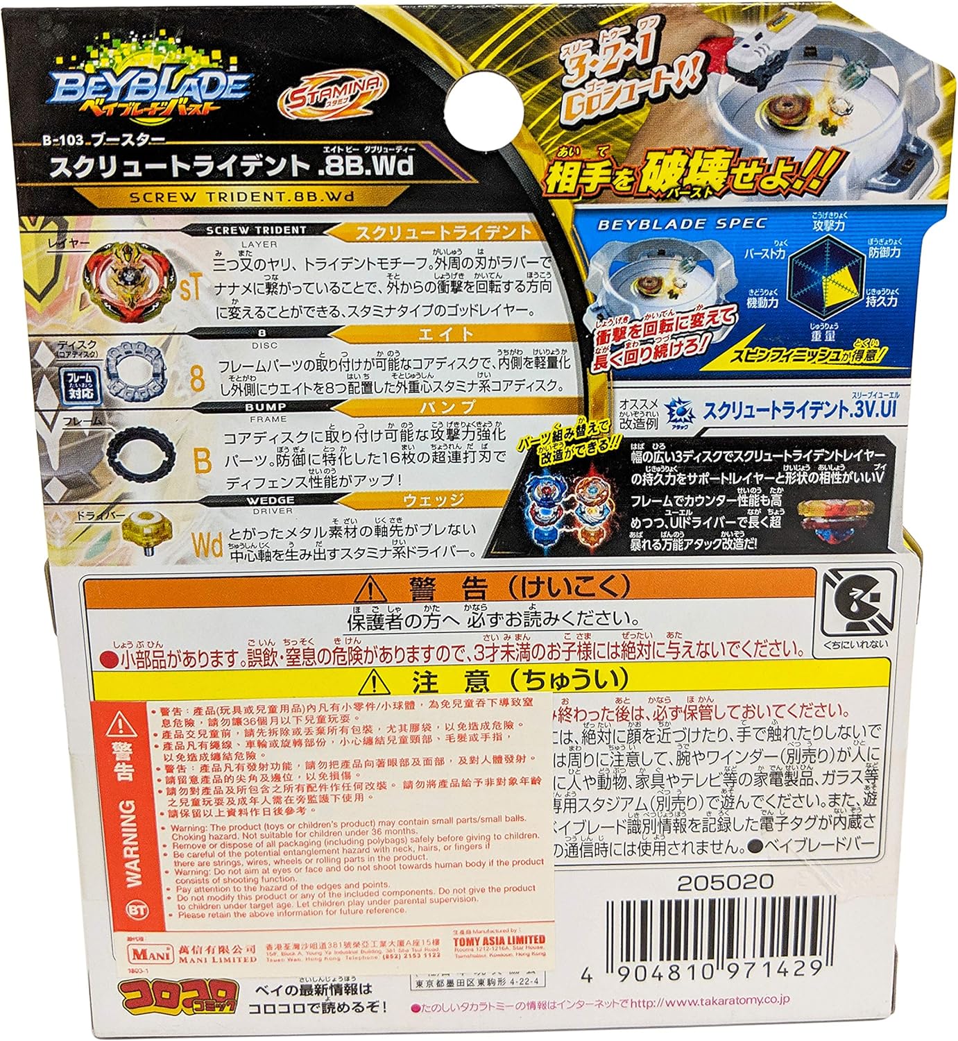 Takara Tomy Beyblade Booster Screw Trident .8B.Wd B-103 adalah sebuah booster Beyblade Burst yang berisi komponen-komponen untuk merakit sebuah Beyblade. terdiri dari Layer: Screw Trident, Disc: .8, Driver: Wd.