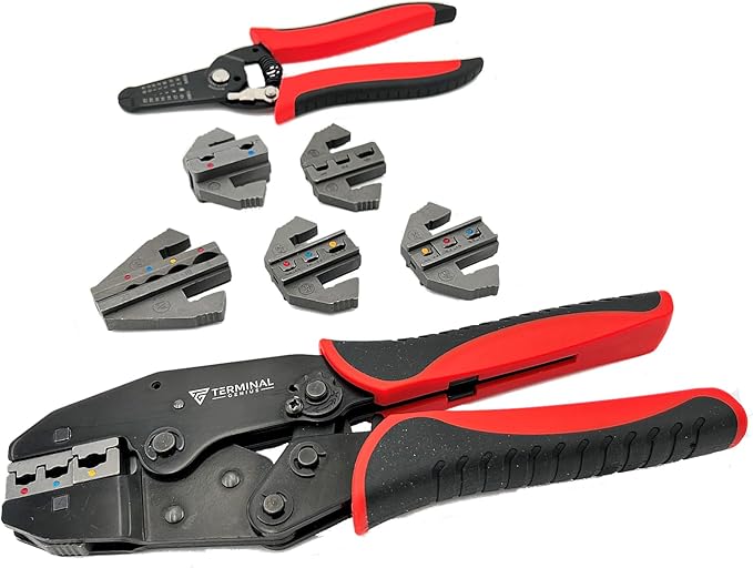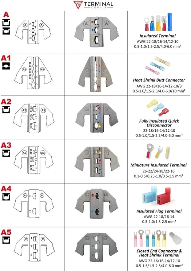 The Terminal Generous 8″ Wire Crimping Tool Kit with Strippers is a full cycle ratcheting crimper ideal for electronic and electrical insulated terminal connectors. Full cycle mechanism ensures each crimp cycle is completed before releasing. Precision dies provide excellent repeatability and high quality crimped connections. This professional grade wire crimping tool set includes an 8″ crimping tool and six quick release interchangeable dies for: (A) Insulated Connectors – (A1) Heat Shrink Butt Connectors – (A2) Insulated Quick Disconnects (A3) Miniature Insulated Terminals – (A4) Insulated Flag Terminals 22-14AWG – (A5) Heat Shrink Terminals and Close End Connectors. The kit also includes a 7″ locking wire stripper, six storage containers and a durable storage case with latches. The quick release interchangeable die sets allow users to quickly switch between terminal types and sizes. No tools required. If you’re used to regular wire crimpers or basic terminal crimpers, you’ll appreciate the comfortable grip, quality construction and reliable crimp connection of the Terminal Genius crimping tool.