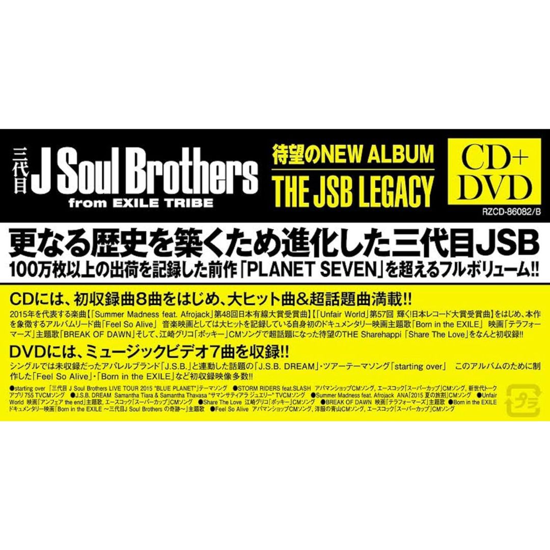 THE JSB LEGACY edisi CD+DVD menampilkan evolusi musik J Soul Brothers lewat Unfair World dan Summer Madness feat. Afrojack, dilengkapi MV dan dokumenter eksklusif.