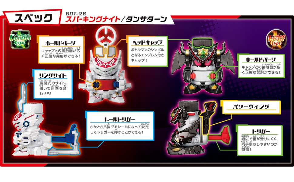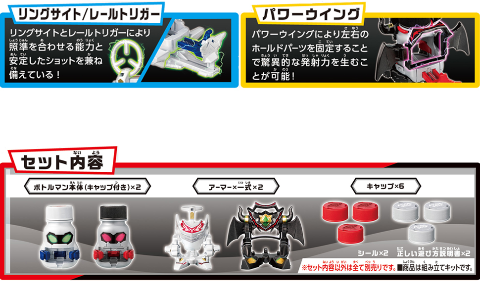 - Dua Bottleman Unik: Set ini berisi dua Bottleman dengan desain dan kemampuan yang berbeda: “Tan Saturn” yang dapat menembakkan power shot dengan power wing, dan “Sparking Knight” yang memiliki akurasi kontrol tinggi dengan rail trigger dan ring sight.