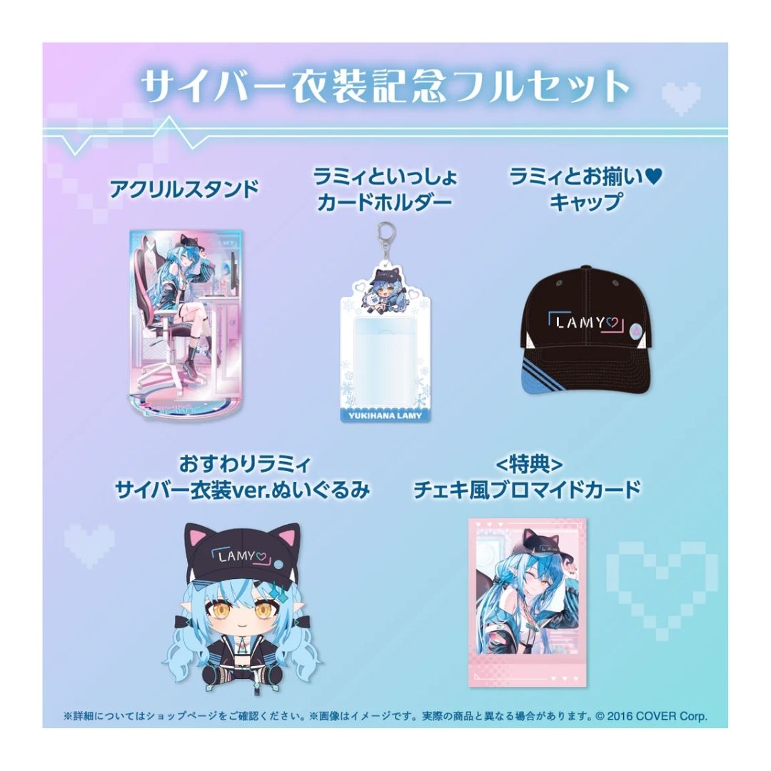 Set lengkap ini berisi 4 jenis barang memorabilia yang menampilkan desain kostum Cyber Lammy yang ikonik. Sebagai bonus spesial, Anda akan mendapatkan “Kartu foto polaroid asli Rin☆Yu” yang secara langsung ditandatangani oleh Yukihana Lammy sendiri (selama persediaan masih ada)!