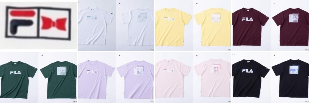 Jajararan produk hasil kolaborasi Detective Conan x FILA antara lain berupa tas jinjing, pouch, dan T-shirt. Terdapat 6 jenis tas jinjing dan pouch dengan pilihan karakter dalam manga Detective Conan: Conan Edogawa, Heiji Hattori, Ai Haibara, Shuichi Akai, Tooru Amuro, dan Kaito Kid serta 7 pilihan T-shirt termasuk Ran Mouri.