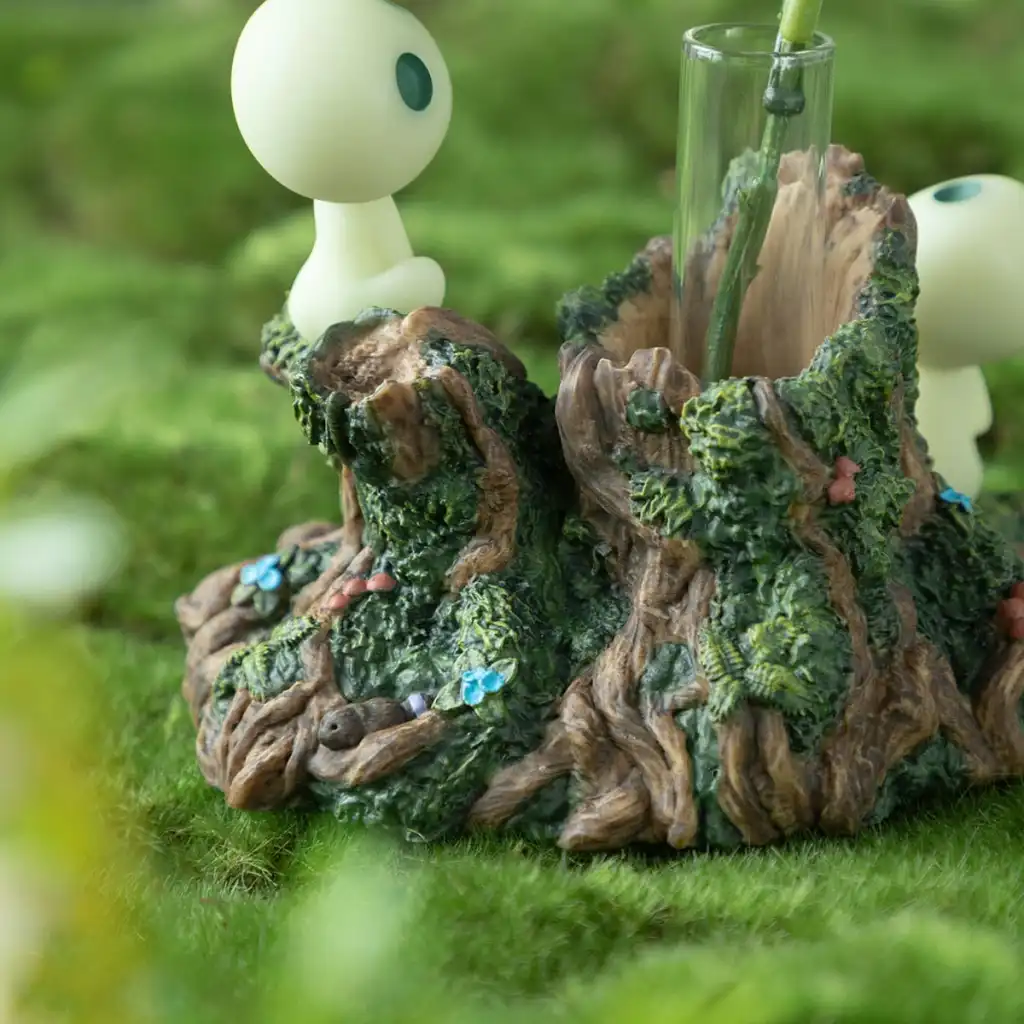 Alih-alih desain standar, vas ini memperlihatkan dua Kodama—roh pohon kecil ikonik dari film—yang duduk manis di atas tunggul kayu berlumut. Detilnya luar biasa: ada pakis, jamur, kupu-kupu, bahkan seekor tikus kecil yang mengintip malu-malu. Setiap elemen ditata dengan hati-hati, membuatnya terasa seperti cuplikan langsung dari dunia Ghibli.