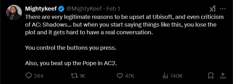 Ada banyak alasan yang sah untuk merasa kesal terhadap Ubisoft, dan bahkan kritik terhadap AC: Shadows… tetapi ketika Anda mulai mengatakan hal-hal seperti ini, Anda kehilangan alur cerita dan sulit untuk melakukan percakapan yang sebenarnya. Anda mengendalikan tombol yang Anda tekan. Selain itu, Anda juga menghajar Paus di AC2.