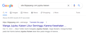 Voila, Google akan menampilkan semua halaman di Titip Jepang yang berkaitan dengan kata kunci yang dicari. Seperti yang Titipers bisa lihat di atas google telah menampilkan artikel yang di Titip Jepang yang berkaitan dengan kata kunci Jujutsu Kaisen. Titipers juga bisa mencoba mencari artikel ini di google dengan menggunakan kata kunci Review Website Titip Jepang. Niscaya google akan langsung menemukan artikel ini dan menampilkannya di hadapan Titipers.